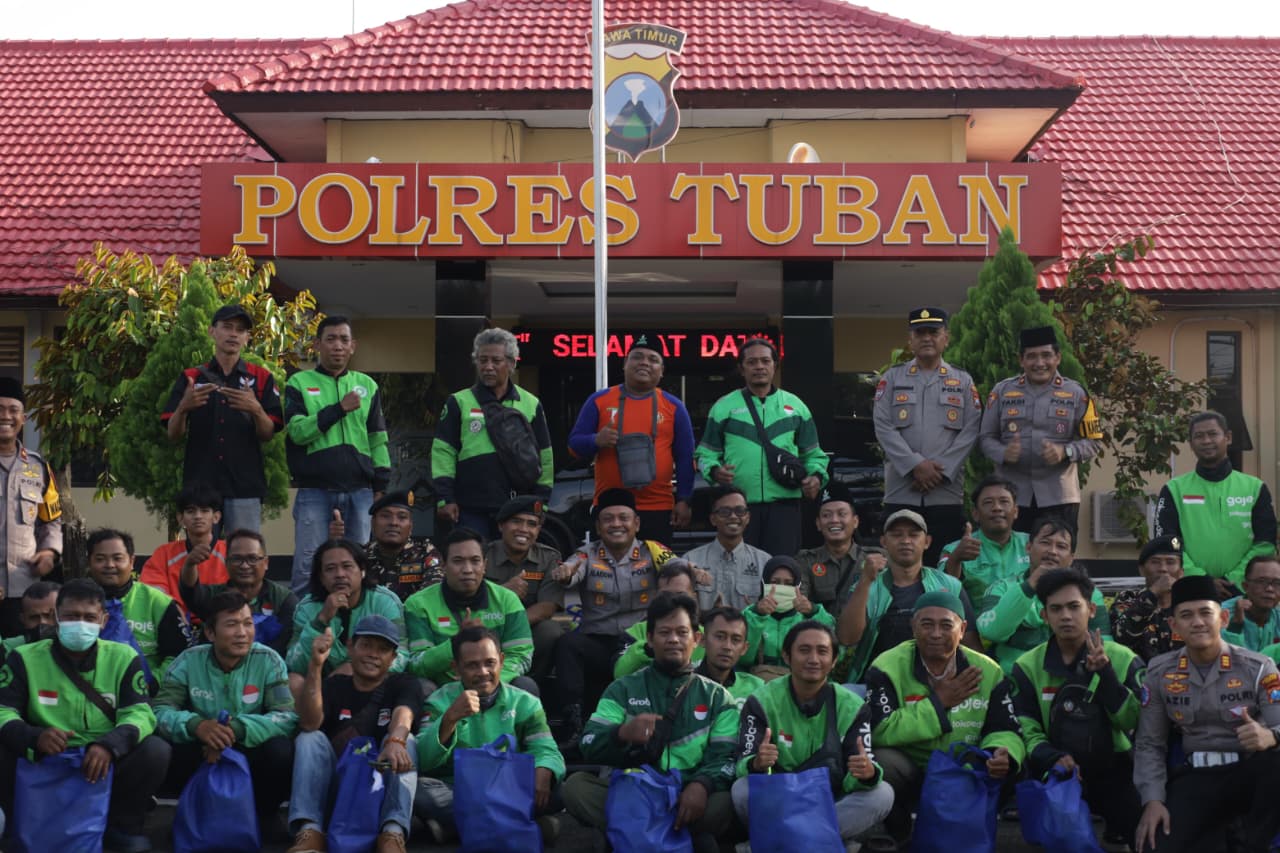 TUBAN – Intiberitanusantara.id – Menjelang waktu berbuka puasa bulan Ramadhan, sore ini nampak Puluhan Polisi bersama komunitas ojek online terlihat berdiri berjajar di depan Mapolres Tuban sambil membawa paket makanan.